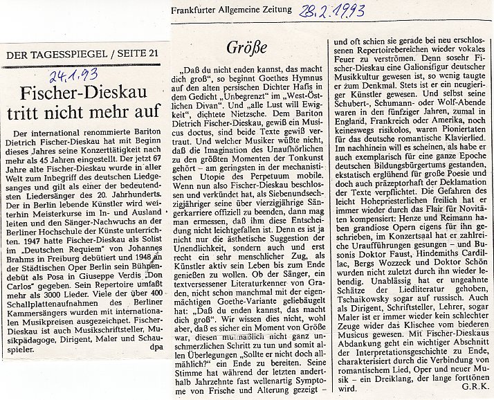 Fischer-Dieskaus Karriere als Sänger begann 1947, als er in der Stadtkirche Müllheim unter Theodor Egel ohne Probe für einen erkrankten Solisten im "Deutschen Requiem" von Brahms einsprang. (Mitunter wird irrtümlich Badenweiler als erster offizieller Auftrittsort genannt.) Im Herbst 1947 gab Fischer-Dieskau seinen ersten Liederabend in Leipzig, schon wenig später trat er höchst erfolgreich im Berliner Titania-Palast auf. Im Herbst 1948 verpflichtete man ihn als ersten lyrischen Bariton an die Städtische Oper Berlin. Gastspielverträge führten Fischer-Dieskau an die Wiener und an die Münchener Staatsoper. Ab 1949 kamen Auslandsgastspiele in England, Holland, in der Schweiz, Frankreich und Italien hinzu. 1952 sang Fischer-Dieskau erstmals bei den Edinburgher Festspielen. Ab 1954 war er ständiger Gast in Bayreuth, ab 1956 in Salzburg (dort hatte er 1954 mit Mahlers "Lieder eines fahrenden Gesellen" unter Furtwängler debutiert). Die Kritiker rühmten immer wieder die verantwortungsbewußte Akribie seiner Interpretationskunst und die enorme stimmliche Schattierungsfähigkeit. Der Opernsänger Fischer-Dieskau sang bevorzugt an der Deutschen Oper Berlin und am Münchener Nationaltheater. Er gastierte an der Wiener Staatsoper, an der Londoner Covent Garden Opera, der Hamburger Staatsoper und während der Edinburgher Festspiele im Kings Theatre. 1954 erst USA Tournee mit Liederabenden und Konzerten, sein erstes Auftreten in der New Yorker Carnegie Hall fand 1964 statt. "Pionierdienste" leistete er u.a. für Hans Werner Henze, Winfried Zillig, Gottfried von Einem und Aribert Reimann. Als "bester Liedersänger der Welt" (Times) füllte Fischer-Dieskau bis Ende 1992 fast selbstverständlich die Konzertsäle. Bleibende Maßstäbe setzte er mit der jedes Wort artikulierenden Genauigkeit seines Vortrags, in dem Text und Musik gleichberechtigt nebeneinandergestellt waren. Unendlich viel tat er für die Verbreitung des hauptsächlich romantischen Klavierliedes. Als Schubert-Gestalter meistbewundert, hat Fischer-Dieskau nach Joachim Kaisers Meinung (SZ, 22.7.1991) eigentlich nur einen wirklich gefährlichen Konkurrenten gehabt, nämlich sich selbst - wie er im Laufe der Jahrzehnte neue Standards gesetzt, neue Wege gesucht, ungeahnte Seelenbewegungen dargestellt hat. Mit Beginn des Jahres 1993 stellte Fischer-Dieskau nach mehr als 45 Jahren seine Konzerttätigkeit ein. Am 31.Dezember 1992 verabschiedete sich Fischer-Dieskau (heimlich) vom öffentlichen Gesang. Seither war er als Lehrer, Dirigent, Rezitator und Buchautor viel beschäftigt. (nach Munzinger Archiv 52/94 (lö) Stand der Ergänzungen: 1998) |