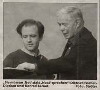 Presse zu Meisterkursen im Jahr 2003:Presse zum Meisterkurs an der UdK in Berlin (8.-11.Januar 2003): "Warum singst du nicht alles?" (Arno Widmann in der 'Berliner Zeitung') und "Dieskaus Pflicht" (Christian Kässer in 'Der Tagesspiegel') Die ersten Hugo Wolf-Tage in St. Paul im Lavanttal:Programm des Abschlusskonzertes,Bericht in den Salzburger Nachrichten, Fotos (20.7.03 St. Galler Tagblatt vom 5.9. zum Meisterkurs bei der Schubertiade 2003: "Auch kleine Dinge" (22.9.03) "Dann fegen Sie mal schön". Meisterkursus mit Dietrich Fischer-Dieskau in der Musikhochschule Detmold. Neue Westfälische. (16.11.03) |