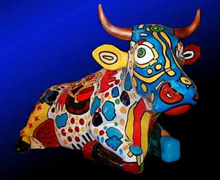 Lady Dieskau, die Kunst-Kuh in Lebensgrösse, bemalt vom renommierten Künstler Michael Fischer, wird jetzt versteigert. Der Erlös geht zu 100% an das Kinder- und Musik-Projekt Köthen/Anhalt (Deutschland). Feb. 2004 |