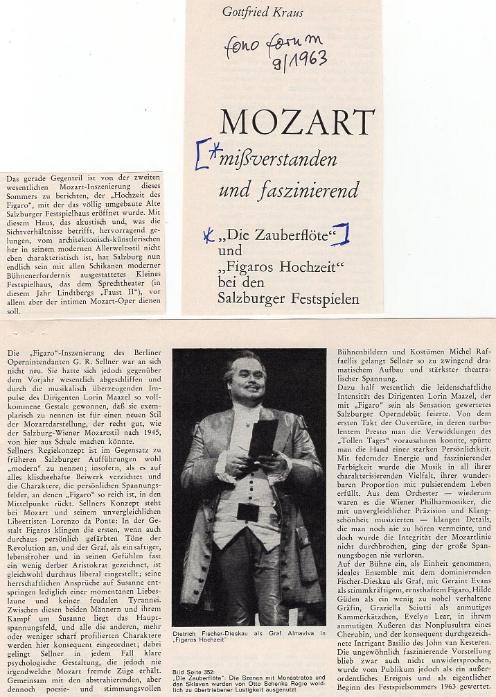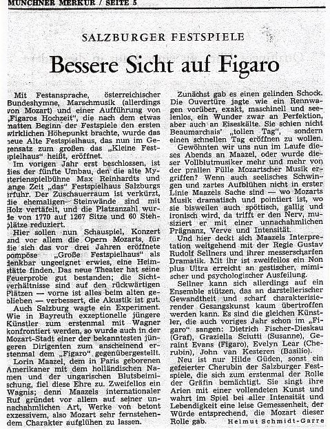 Leider war dieser "Figaro" sehr unerfreulich, sehr unmozartisch und intellektuell überspitzt – eine Wiedergabe, wie wir sie bei den Festspielen in den letzten dreißig Jahren nicht gesehen haben. Böhm-Rennerts treffliche Inszene von 1960 mit einer ausgezeichneten Wiener Besetzung wurde eliminiert und dafür der bekannte bundesdeutsche Regisseur Gustav Rudolf Sellner mit der Regie, der Italiener Michael Raffaelli mit den Bühnenbildern und Lorin Maazel mit der musikalischen Leitung betraut.