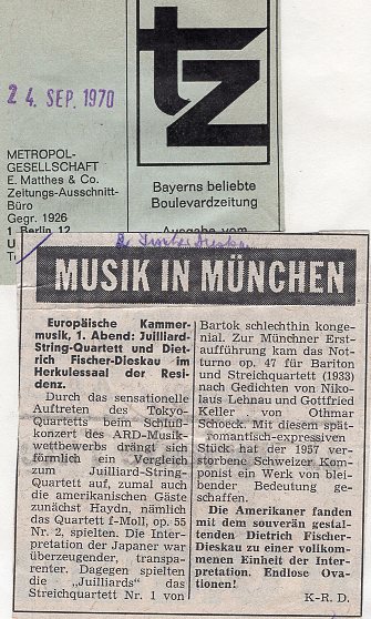 Wieder einmal konnte man Fischer-Dieskaus vielfältige Gestaltungskraft, den divinatorischen Gebrauch seiner künstlerischen Mittel bewundern. Den schwierigen instrumentalen Part meisterte das Juilliard-Quartett mit intimer Virtuosität, großer Farbigkeit und feiner Anpassung. [...]