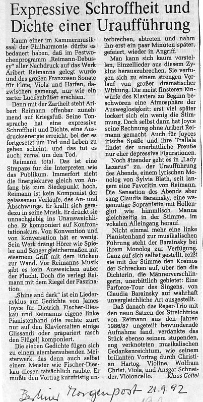 Nach solchen interessanten, aber nicht sonderlich perspektivenreichen künstlerischen Erfahrungen des Festwochen-Konzertlebens war es überwältigend, dem ersten von insgesamt vier kompositorischen Porträts des Berliner Komponisten Aribert Reimann zu begegnen. Der Abend begann tastend mit der zarten Klangwelt von Reimanns "Nocturnos für Violoncello und Harfe" (1956) und schien ungut auseinanderzubrechen, als Dietrich Fischer-Dieskau einer plötzlichen stimmlichen Indisposition nachgab und Reimanns Zyklus nach Texten von James Joyce "Shine and dark" (1989) für Bariton und Klavier (linke Hand) unterbrach. Der von Fischer-Dieskau schließlich bravourös-meisterlich vollendete Zyklus wurde für den engagierten Sänger und den am Klavier sekundierenden Komponisten zuletzt dann doch ein lang und herzlich gefeierter Erfolg.
